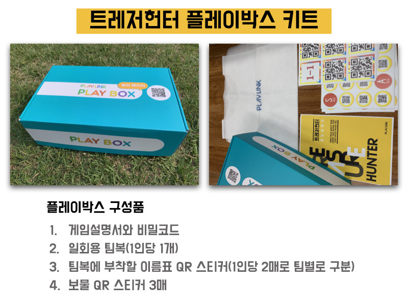 직접 진행을 원하실 경우, 2명의 진행비(20만원)를 할인하며, 미션탐험대를 플레이할 수 있도록 플레이박스를 배송해 드립니다. 게임에 대한 설명서, 진행에 필요한 매뉴얼을 함께 보내드립니다. (배송완료까지 3~4영업일 소요)